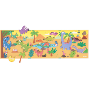 Gioco magnetico educativo con 30 calamite a tema dinosauri, ideale per bambini dai 3 anni in su. Lo sfondo illustrato pieghevole permette di creare scene preistoriche e inventare storie divertenti, stimolando immaginazione e motricità fine.