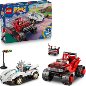 Il set include due veicoli dettagliati: una veloce auto da corsa bianca per Silver e un potente monster truck rosso e nero per Knuckles, pronti a sfidarsi su ogni terreno. Grazie agli accessori inclusi, come il semaforo di partenza, la cassetta degli attrezzi e i Chaos Emerald, i bambini possono inventare storie sempre nuove e vivere avventure ricche di azione.