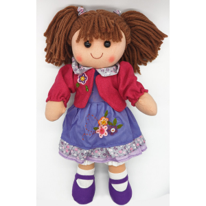 Bambola in pezza con giacchetta rossa e gonna viola. Capelli castani. Altezza 25 cm. Tutti i particolari sono in stoffa